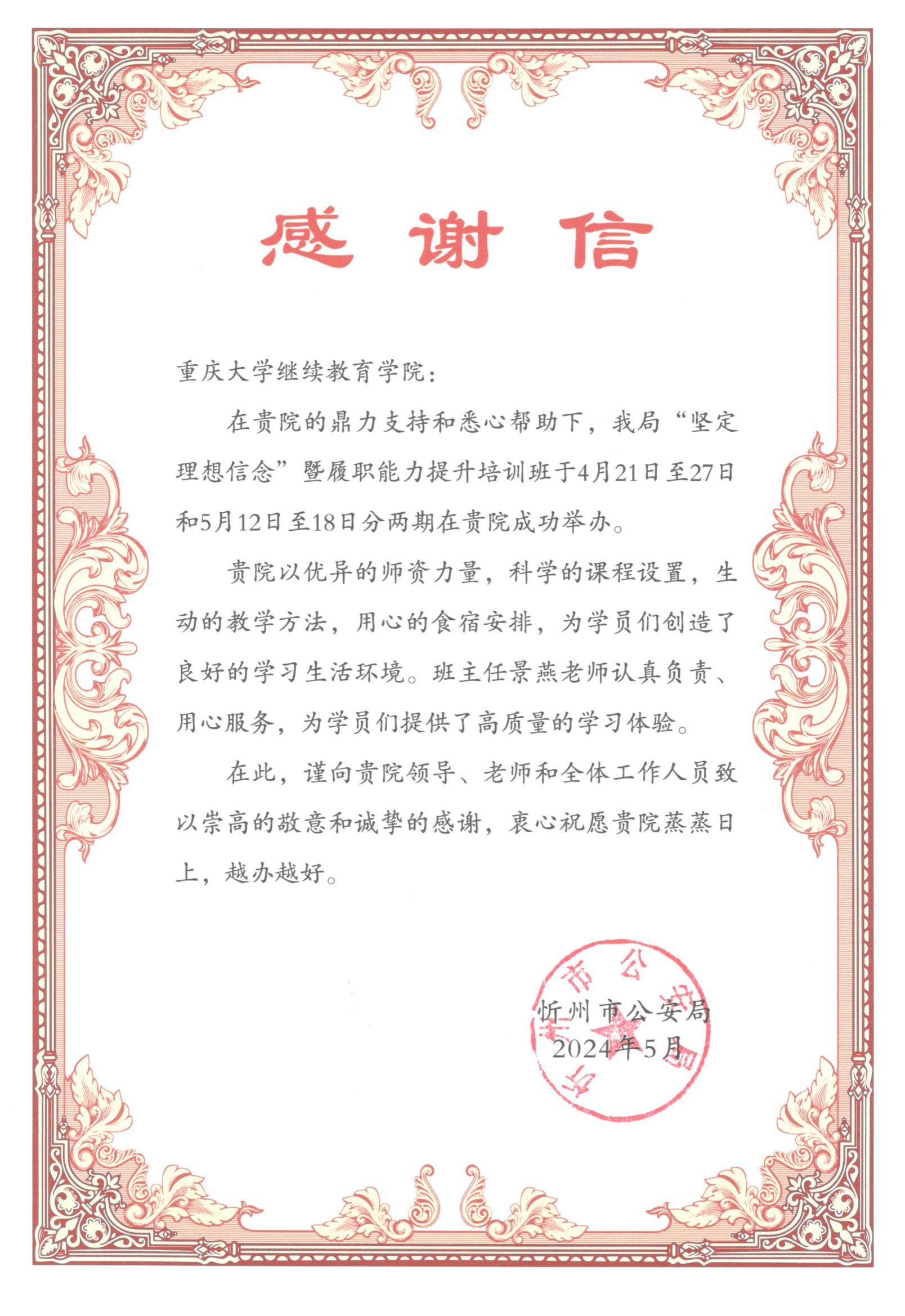 为全面贯彻习近平新时代中国特色社会主义思想,深入贯彻落实党的二十大精神,结合2024年公安系统的履职能力提升需求,忻州市公安局分别于2024年4月21日至27日、5月12日至18日在重庆大学继续教育学院开展公安系统干部综合素质、专业技能和对形势变化的适应培训。第一期培训结束后,忻州市公安局为学院发来感谢信。