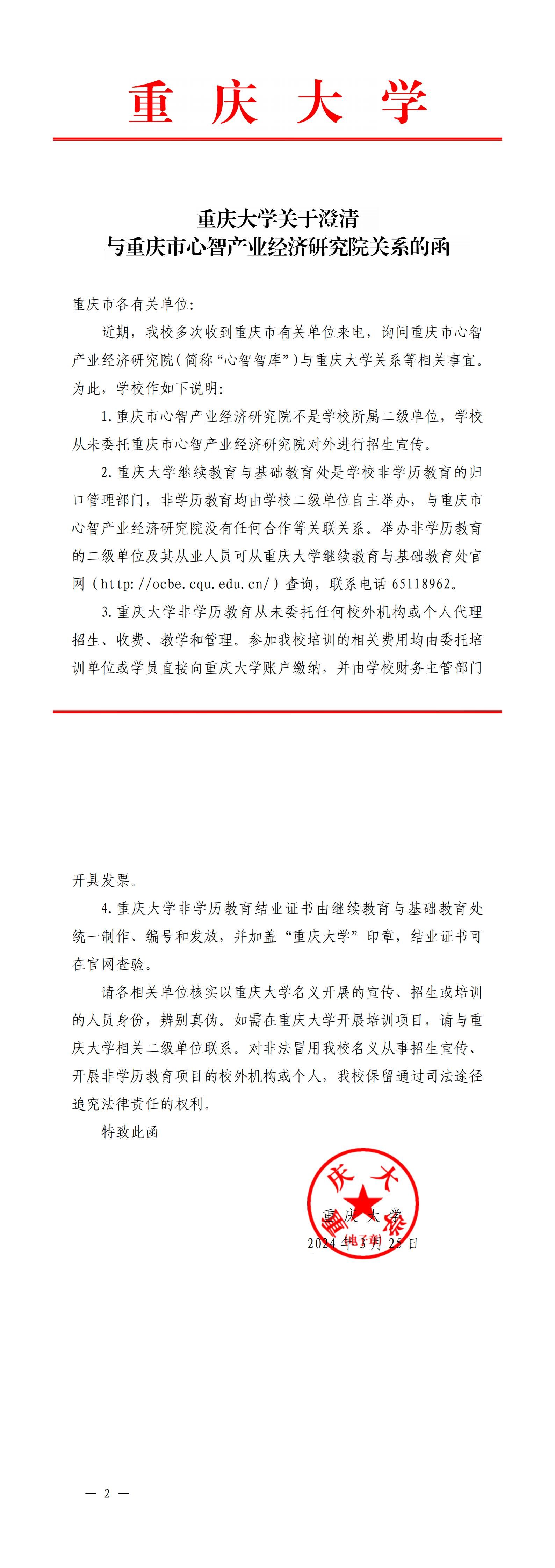 重庆大学关于澄清与重庆市心智产业经济研究院关系的函