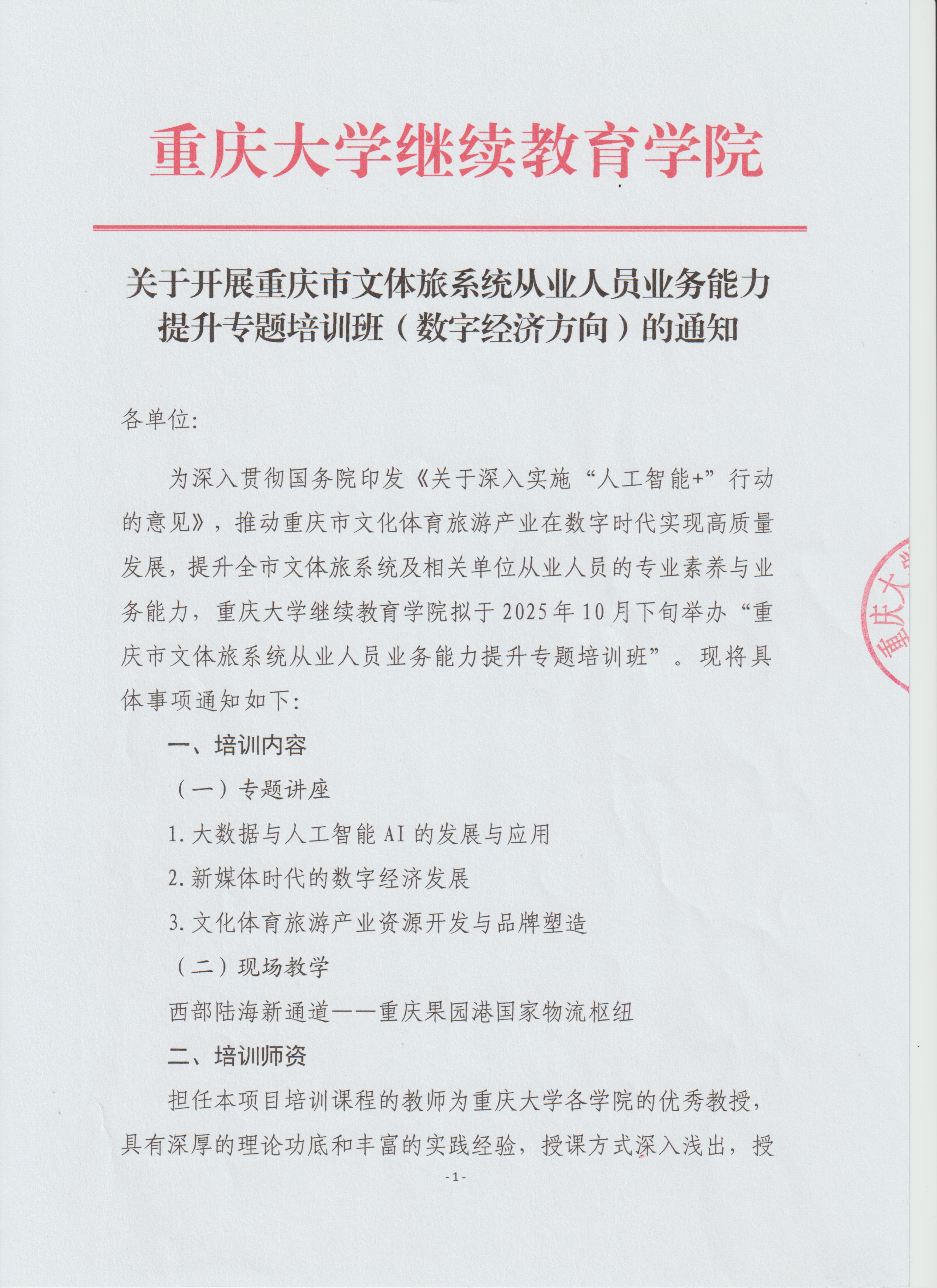 关于重庆市文体旅系统从业人员业务能力提升专题培训班(数字经济方向)的通知